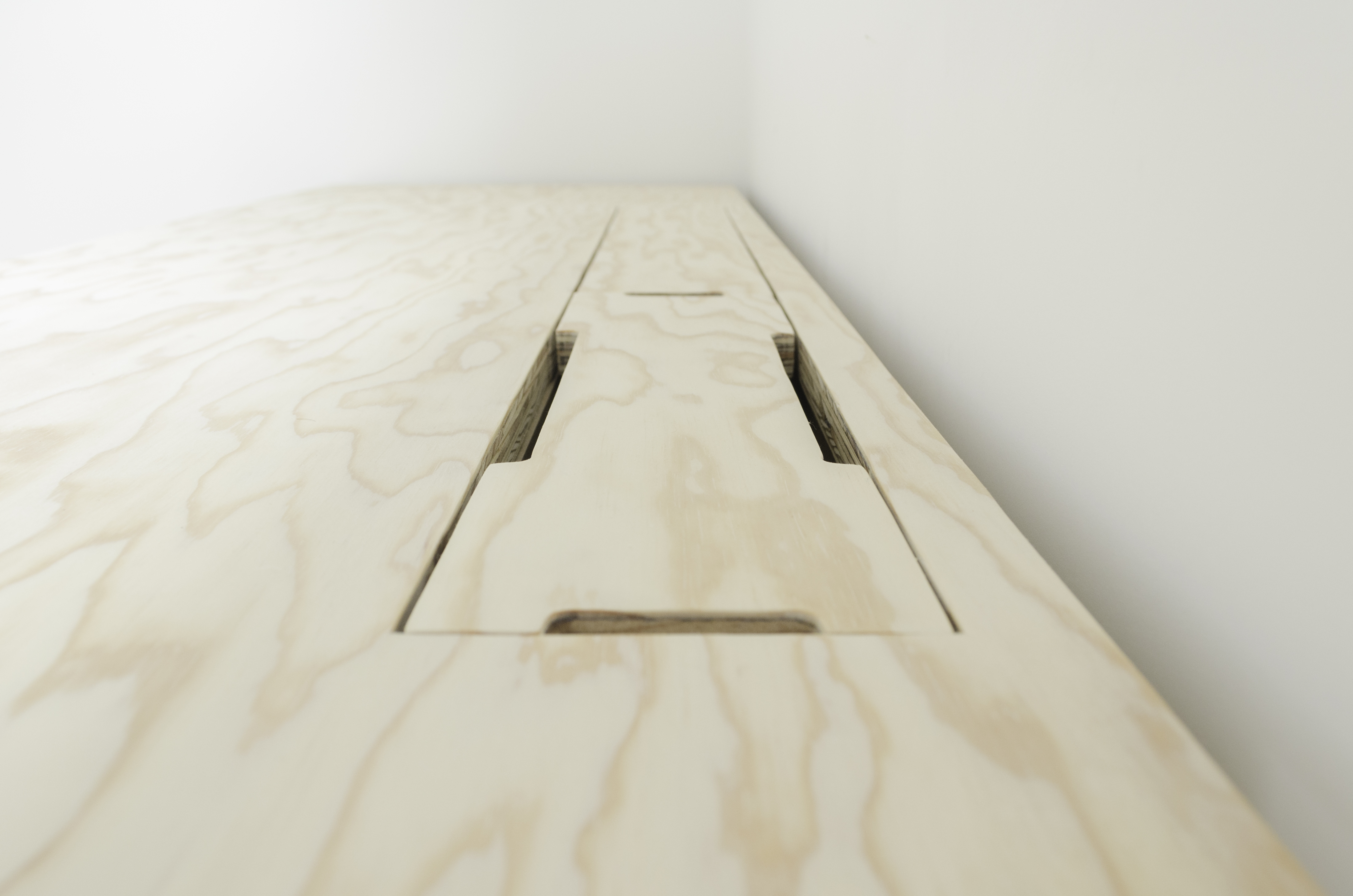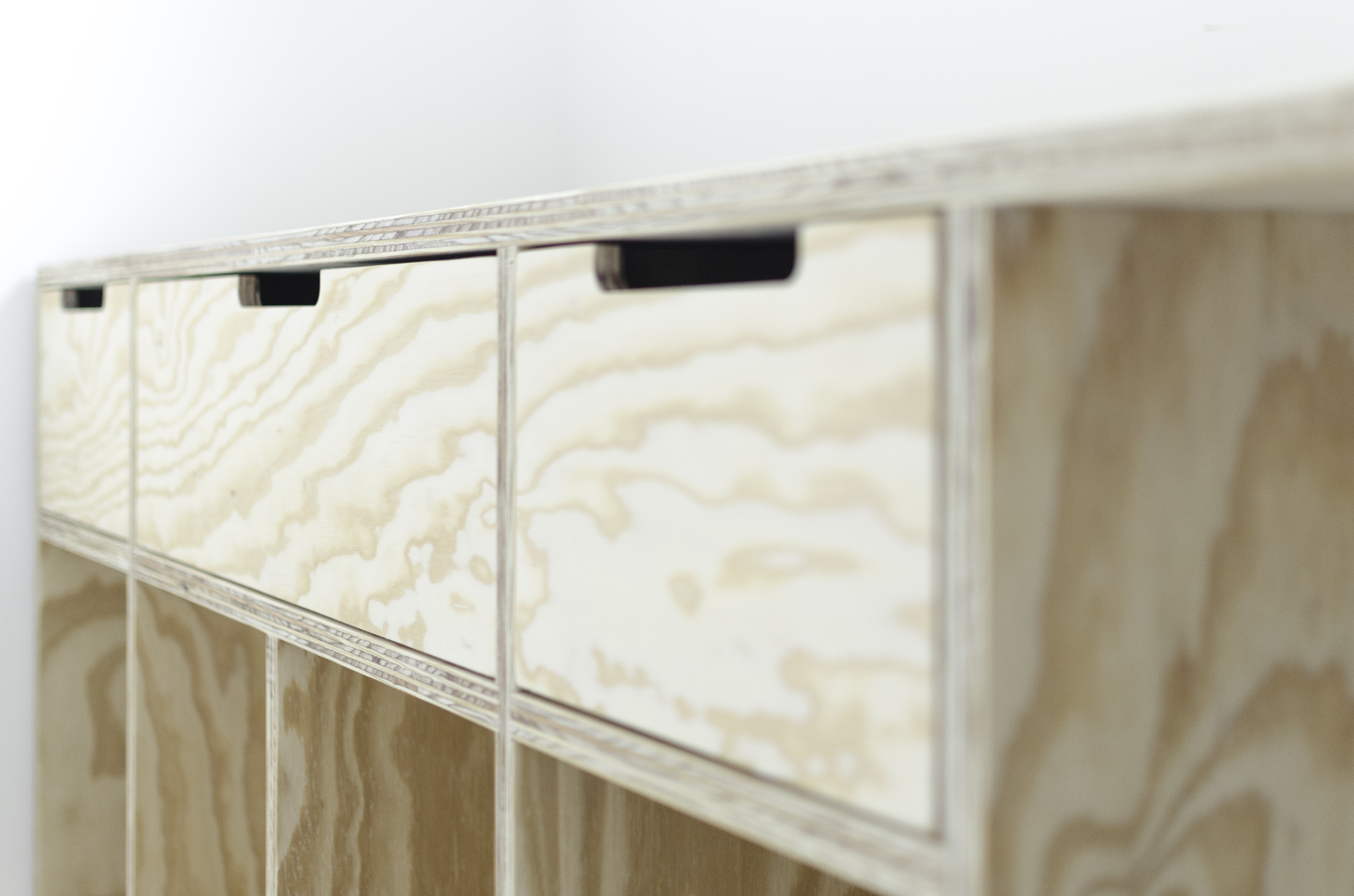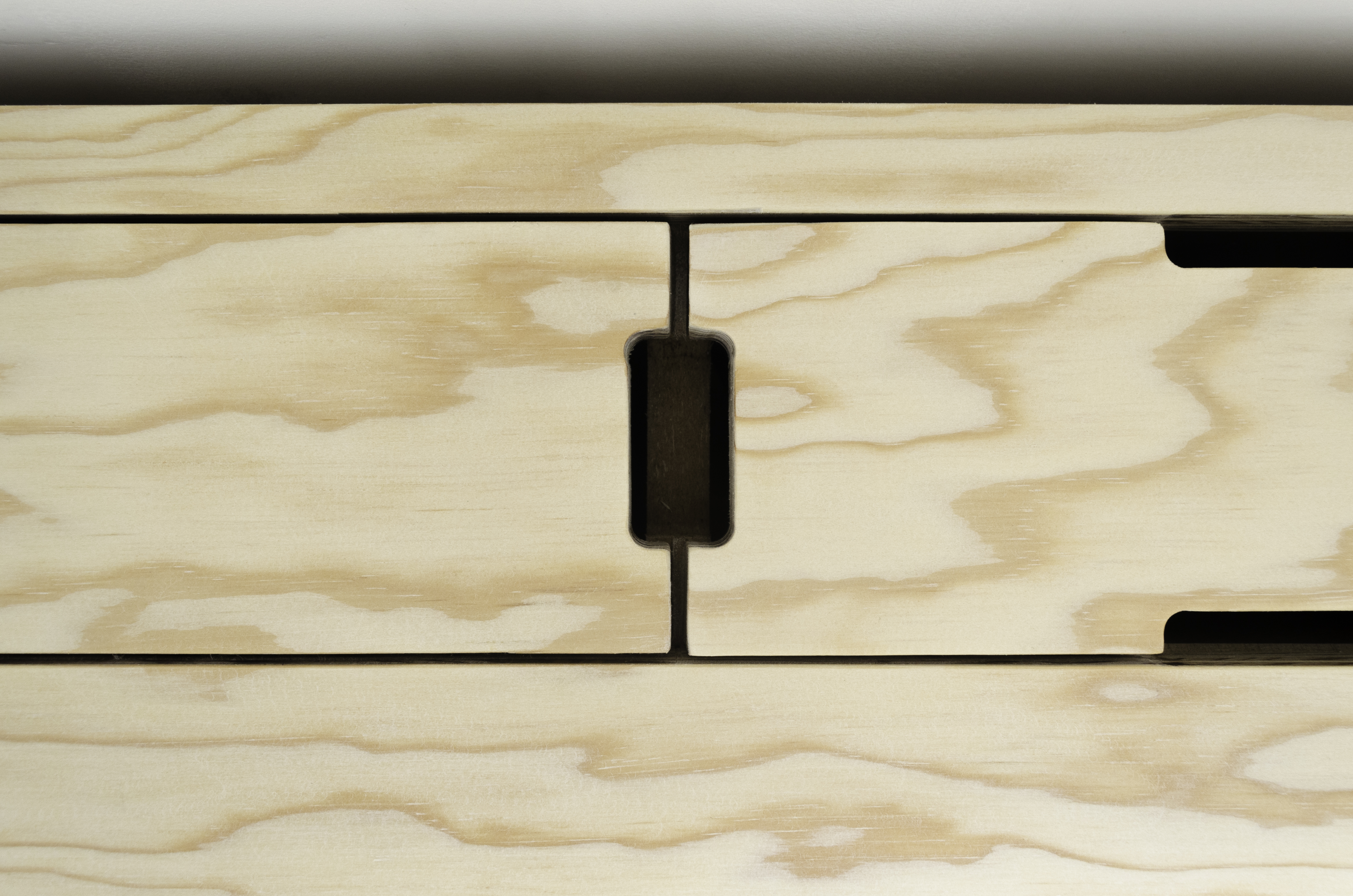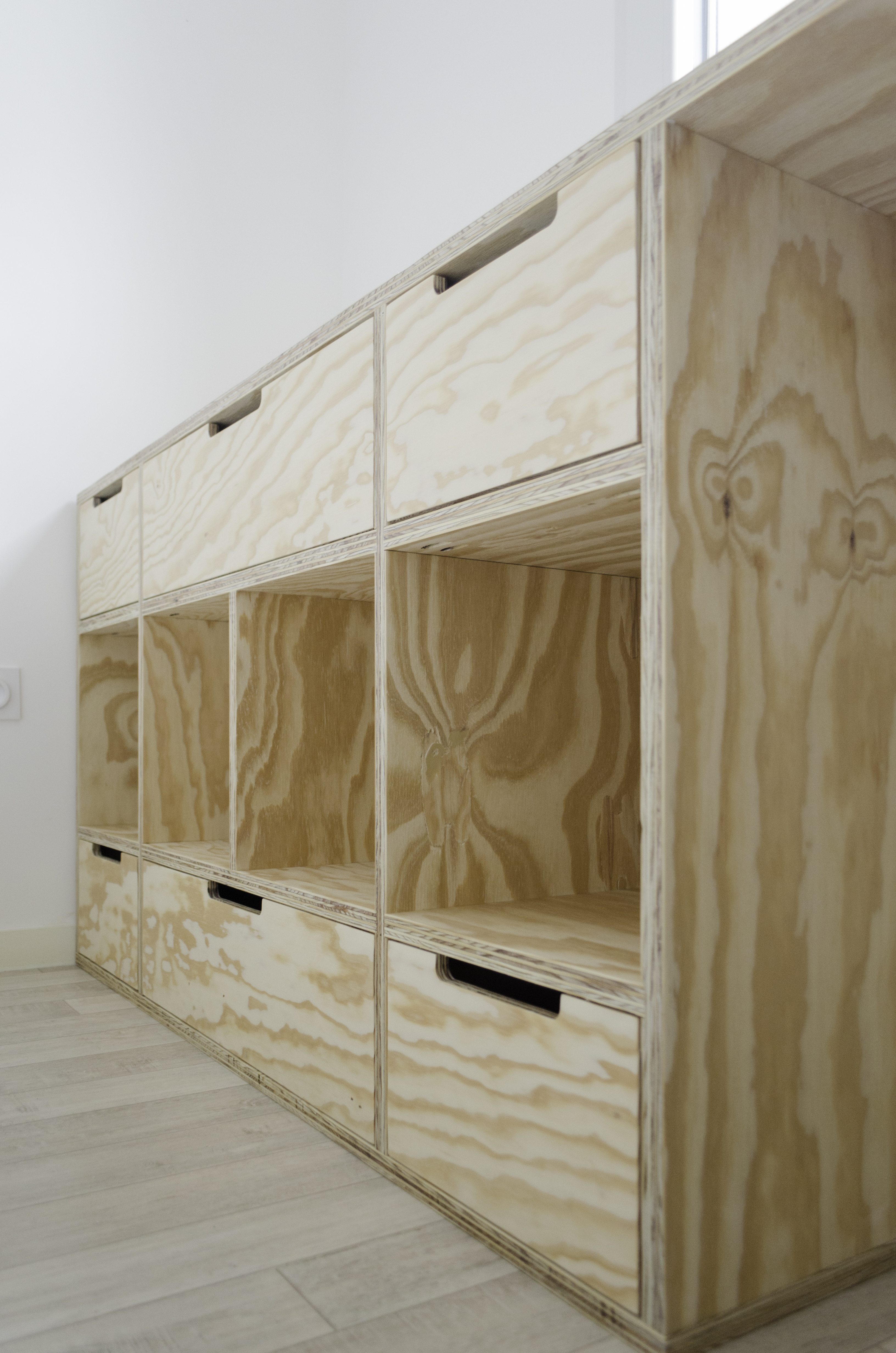 Meuble réalisé à partir de contreplaqué de pin, dans un dessin très sobre, faisant la part belle au matériaux et mettant en valeur les différents aspects du bois ; ses tranches et le veinage de ses applats.